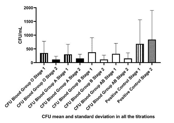 After the preparation of serial dilutions, 100 µL of serum from volunteers was added to the microcentrifuge tubes. Serum preparation was performed by separating red blood cells using centrifugation of 1,000 g for 10 minutes and separated by blood groups A, B, O, and AB (negative control) in each dilution series. The preparation of the final solution (saline with inoculum + serum) did not exceed 20 minutes, aiming at preserving the concentration of bacterial cells. Subsequently, 100 µL each solution was inoculated (saline with inoculum + serum) by spreading with the Drigalski inoculation loop in Petri plates with Mueller-Hinton agar (identified according to blood groups and dilutions) incubated at 35 °C for 24 hours. After incubation, the colony-forming units (CFU) were counted.