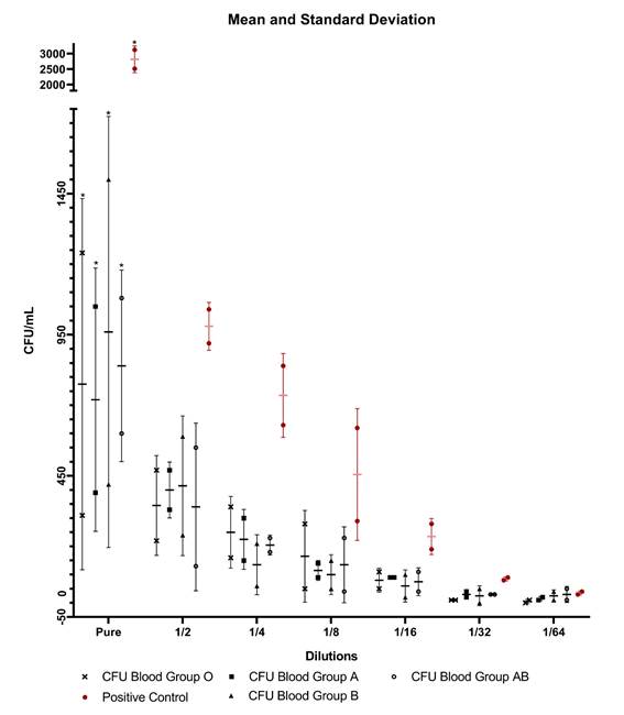 There was a significant difference in pure human serum when blood group A x Positive Control (p<0.0001) was analyzed; likewise for blood group B x Positive Control (p<0.0001); blood group AB x Positive Control (p<0.0001) and blood group O x Positive Control (p<0.0001), corroborating with the results found in the study by Gomes et al. Although Figure 2 and Table 1 shows a reduction in the CFU count, no significant difference was observed in the other dilutions. Table 1 was generated through the mean colony count carried out in the test 1 and 2. The colony forming units could be seen in Supplementary Material Fig S.1 and S.2.
