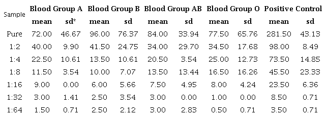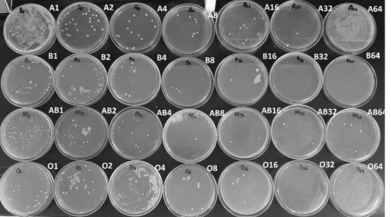 Legend: A1 = Human serum blood group A and inoculum; A2 = Human serum blood group A and inoculum 1:2; A4 = Human serum blood group A and inoculum 1:4; A8 = Human serum blood group A and inoculum 1:8; A16 = Human serum blood group A and inoculum 1:16; A32 = Human serum blood group A and inoculum 1:32; A64 = Human serum blood group A and inoculum 1:64; B1 = Human serum blood group B and inoculum; B2 = Human serum blood group B and inoculum 1:2; B4 = Human serum blood group B and inoculum 1:4; B8 = Human serum blood group B and inoculum 1:8; B16 = Human serum blood group B and inoculum 1:16; B32 = Human serum blood group B and inoculum 1:32; B64 = Human serum blood group B and inoculum 1:64; AB1 = Human serum blood group AB and inoculum; AB2 = Human serum blood group AB and inoculum 1:2; AB4 = Human serum blood group AB and inoculum 1:4; AB8 = Human serum blood group AB and inoculum 1:8; AB16 = Human serum blood group AB and inoculum 1:16; AB32 = Human serum blood group AB and inoculum 1:32; AB64 = Human serum blood group AB and inoculum 1:64; O1 = Human serum blood group O and inoculum; O2 = Human serum blood group O and inoculum 1:2; O4 = Human serum blood group O and inoculum 1:4; O8 = Human serum blood group O and inoculum 1:8; O16 = Human serum blood group O and inoculum 1:16; O32 = Human serum blood group O and inoculum 1:32; O64 = Human serum blood group O and inoculum 1:64.