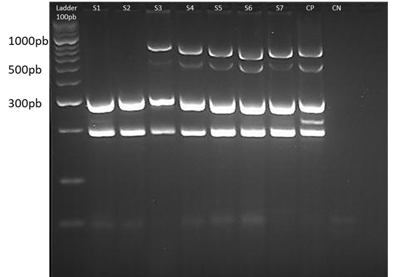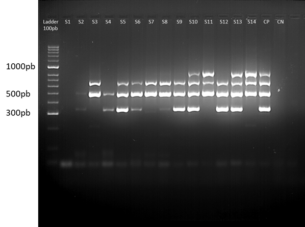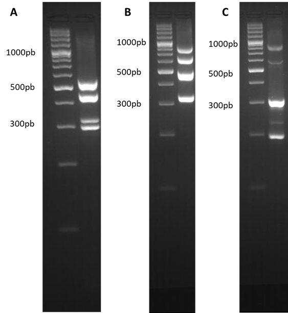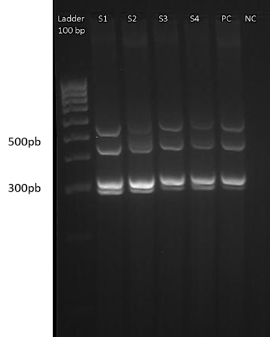 The reaction mixture contained a final volume of 25 μl: 2 μl of DNA, 2.5 μl of the buffer, 0.25 mM of dNTP (1.2 μl), 3 mM MgCl2 (1.5 μl), oligonucleotides 0.25-1 μM (0.625 μl) Taq polymerase 0.2 μl and nuclease-free H2O 13,9 μl. The products were visualized by electrophoresis using 4% agarose gel (w/v) in a 1X TAE buffer run at 100 V for 80 minutes.