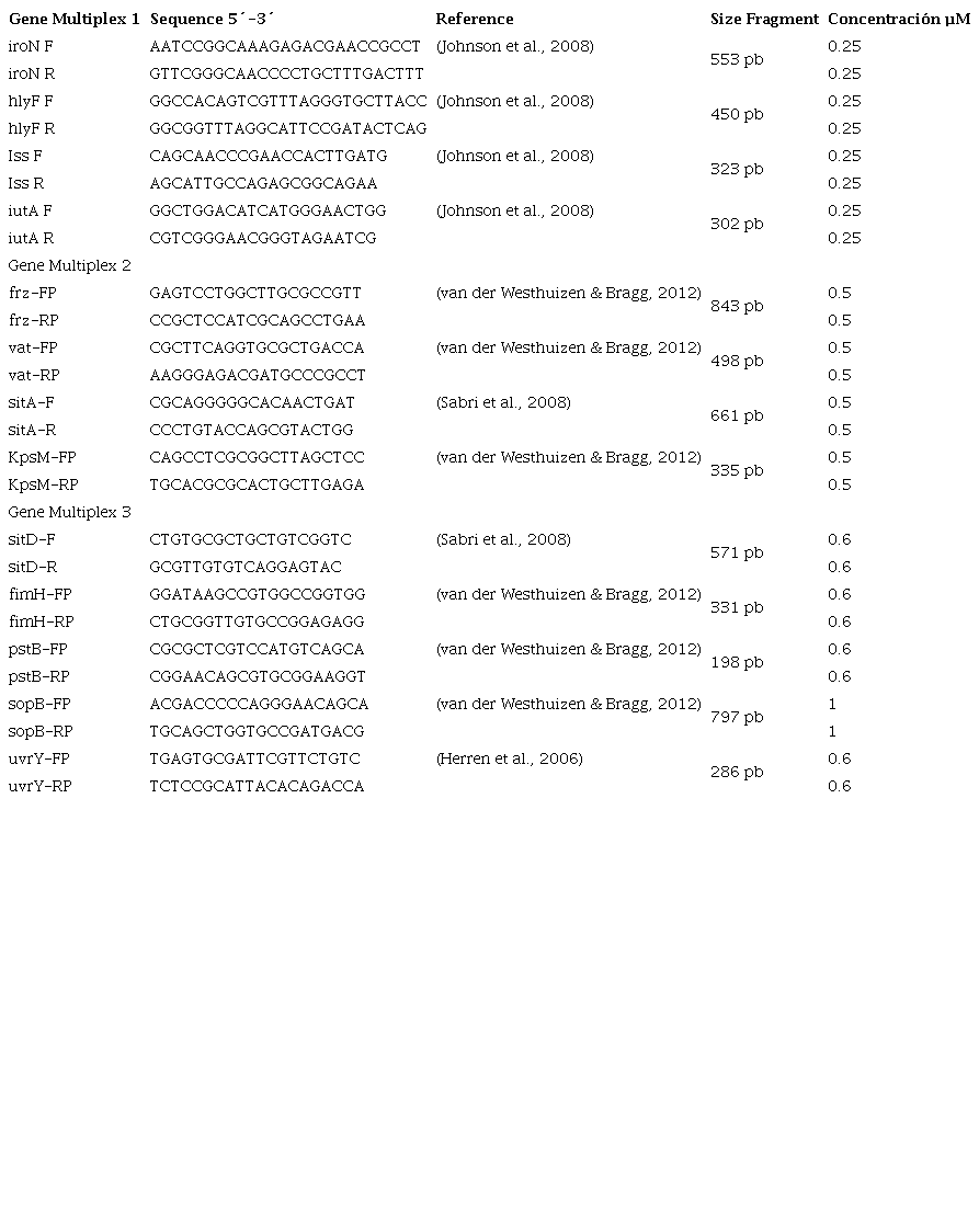 A total of 47 E. coli strains were isolated from the cultures of oviduct, lung, and liver. Samples. A bacterial pool containing E. coli strains with different virulence factors was used as a positive control since no strain had all the virulence factors in study. The three multiplex PCRs were run with the DNA pool to ensure that under the proposed conditions the different genes were amplified (Fig. 1).