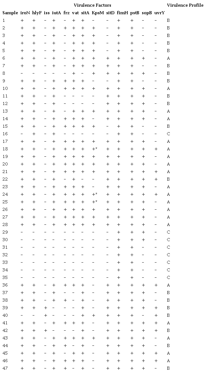 The results were analyzed to generate the following virulence profiles according to the number of genes related to virulence factors found in the different strains: profile A, isolates that had between 10 and 13; profile B, those that had between 5 and 9 and in profile C, those who had 4 or less virulence factors.
