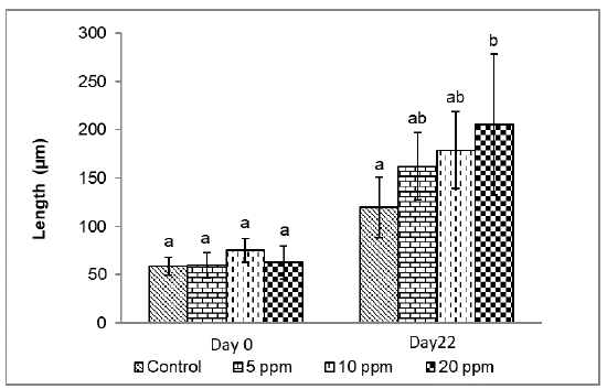 Figure 3 shows the measurement of the intestinal folds at the experiment's beginning and end. Initially, no significant difference was observed between treatments (p<0.05), which allows us to infer that the catfishes presented the same initial conditions. At the end of the experiment, a significantly greater length of intestinal folds (p<0.05) was found in larvae with the inclusion of 20 ppm of probiotics (205.3±72.7 µm), compared to the control (119.7±31.4 µm); but without statistical difference with the larvae maintained at 5 ppm (162.2±34.5 µm) and 10 ppm (179.0±39.9 µm).