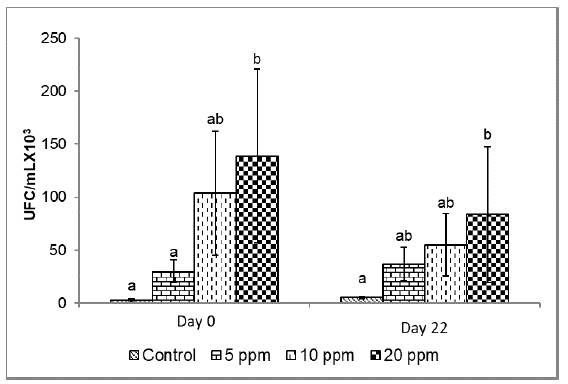 Microbiological analysis of water.Figure 4 presents the counts of colony-forming units (CFU) in the culture water in the different treatments. At the beginning of the experiment, a higher number of CFU was observed at 20 ppm (138.7±81.9 CFU/ml x 103), being statistically different from the control group and at 5 ppm (p<0.05). At the end of the experiment (day 22), a higher CFU concentration was recorded in the treatment with 20 ppm inclusion (83.5±64 CFU/ml x 103) without observing a significant statistical difference when the probiotics were included at 5 ppm (36.5±16.0 UFC) and 10 ppm (55.0±29.5 UFC), but with the control group (5.3±1.2 UFC) (p<0.05).