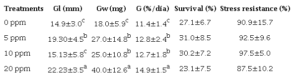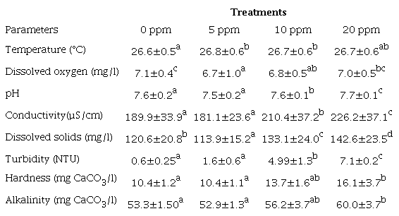 Physicochemical parameters of water. The average values of the water quality parameters are presented in table 2. The higher temperature occurred in the 5 ppm treatment (26.8±0.6°C) and the lower in the control group (26.6±0.5°C), observing statistical difference between these values (p<0.05). The higher dissolved oxygen concentration was recorded in the control group (7.1±0.4 mg/l) and the lower in 5 ppm (6.7±1.0 mg/l), showing significant differences (p<0.05). For the parameters pH, electrical conductivity, dissolved solids, hardness and total alkalinity, the higher averages occurred at 20 ppm treatment, while the lower were at 5 ppm (Table 2). The most elevated turbidity (7.7±0.2 NTU) was recorded in the 20 ppm treatment and the lowest (0.6±0.25 NTU) in the control group, observing a statistical difference between these values (p<0.05).
