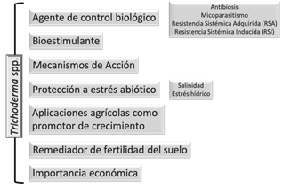 Aunque el mecanismo de Trichoderma por el cual se ejerce el efecto benéfico ante la salinidad puede ser de diversa índole, éste está relacionado con la producción de enzimas antioxidantes como guayacol peroxidasa, peroxidasa, superóxido dismutasa, catalasa, ascorbato peroxidasa y glutatión reductasa y con la acumulación de solutos compatibles que activan los mecanismos antioxidantes y, en efecto hay una reducción del daño oxidativo por problemas de exceso de aniones en las raíces y brotes de las plantas (Fu et al., 2017). Sin embargo, mucho se desconoce sobre los factores de estrés en diversas especies de plantas en entornos limitantes, por lo que es importante el estudio de la diversidad de especies del género Trichoderma en numerosos ecosistemas, ya que esto brinda mayor comprensión sobre su aporte ecológico, biotecnológico y económico a los agroecosistemas.