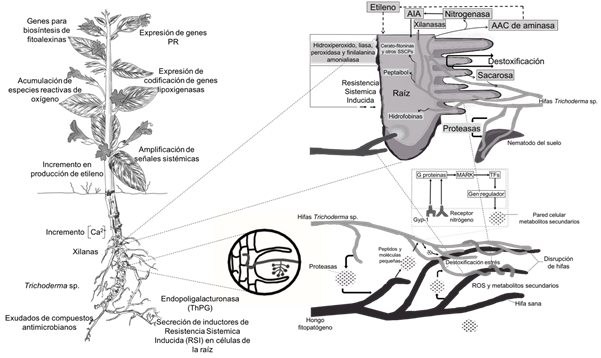 Resistencia sistémica inducida (RSI) y adquirida (RSA). La resistencia sistémica intervenida por microorganismos se categoriza en resistencia sistémica adquirida (RSA) inducida por patógenos y resistencia sistémica inducida por rizobacterias no patógenas (RSI). De manera general, está documentado que las moléculas de microorganismos no patógenos precipitan la respuesta inmune de las plantas a través de la RSI, impulsada a través de las vías de señalización del ácido jasmónico (JA) y etileno (ET). Mientras que las moléculas de origen patógenico inducen la RSA impulsada por ácido salicílico (SA). Sin embargo, Trichoderma tiene la capacidad de mostrar los dos tipos de resistencia, un ejemplo lo describe el estudio de Alkooranee et al. (2017), donde la colonización de raíces por Trichoderma harzianum TH12 logro inducir RSI. Mientras que la aplicación de su filtrado libre de células indujo RSA a Sclerotinia sclerotiorum. En plantas de maíz, la inoculación con dos cepas de Trichoderma gamsii identificadas como IMO5 y B21 dieron como resultado en resistencia sistémica contra F. verticillioides y fue específica de cada cepa. La identificada como IMO5 mejoró la expresión de los genes marcadores ZmLOX10, ZmAOS y ZmHPL responsables de la producción de JA relacionado con la RSI. Por otra parte, la cepa B21 mejoró la expresión de los genes ZmPR1 y ZmPR5 respectivos de SAR (Galletti et al. 2020). Actualmente para hablar de este tipo de resistencia mediada por el género Trichoderma se usa la expresión respuesta de defensa inducida o RDI, para abarcar todas las formas de resistencia inducida, tanto local como sistémica, no obstante, por las rutas bioquímicas de señalización se puede identificar cuál de ellas es la que está presente (RSI y RSA) (Salwan et al. 2022).