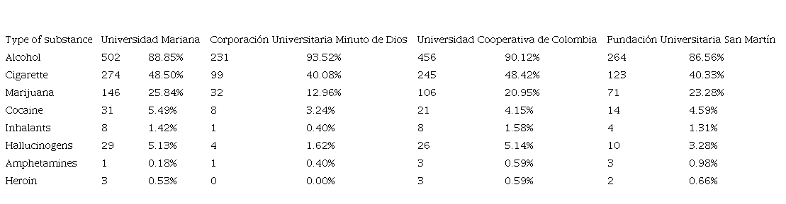 Article result of the research entitled: Magnitud del consumo de drogas en población universitaria de la ciudad de San Juan de Pasto [Extent of drug use in the university population of San Juan de Pasto, Colombia], developed from June 1st 2020 to September 23rd 2022, in Nariño, Colombia.