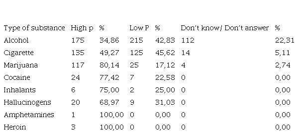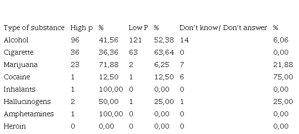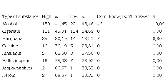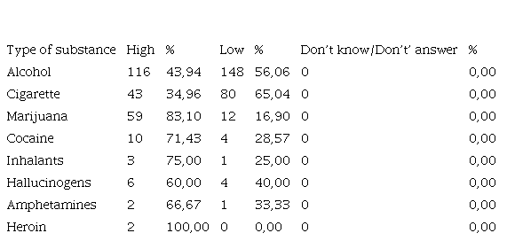 The percentages of Don’t know/Don’t answer are low or zero for all substances. These data confirm the need for prevention and education programs, especially for alcohol and cigarette consumption.