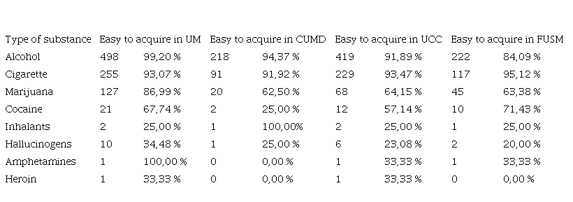 Regarding the ease of access and supply of drugs in general, the option ‘It would be easy for me to get’, ranked alcohol first, then cigarettes, followed by the first illegal drug: marijuana. In this regard, it is important to note that where availability, ease of access and supply are greatest, consumption rates are highest.