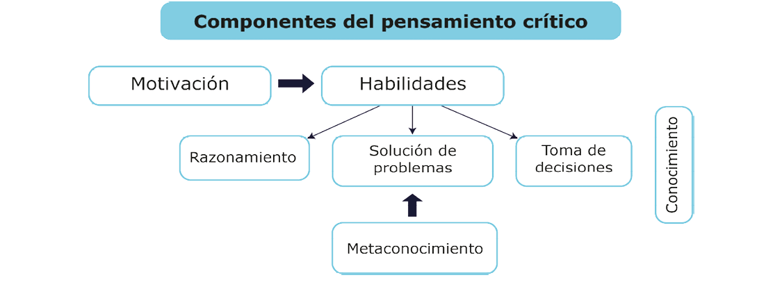 En la Figura 1, se mencionan los componentes del pensamiento crítico que, según Olivares et al. (2013), permiten la comprensión y apropiación del conocimiento, donde hay una fuerte interrelación entre factores como la motivación y habilidades del estudiante. Esto conlleva que, frente a un problema, a través de un razonamiento, el estudiante pueda analizar la situación para plantear posibles soluciones y de esta manera facilitar la toma de decisiones, favoreciendo la adquisición de un conocimiento integral.