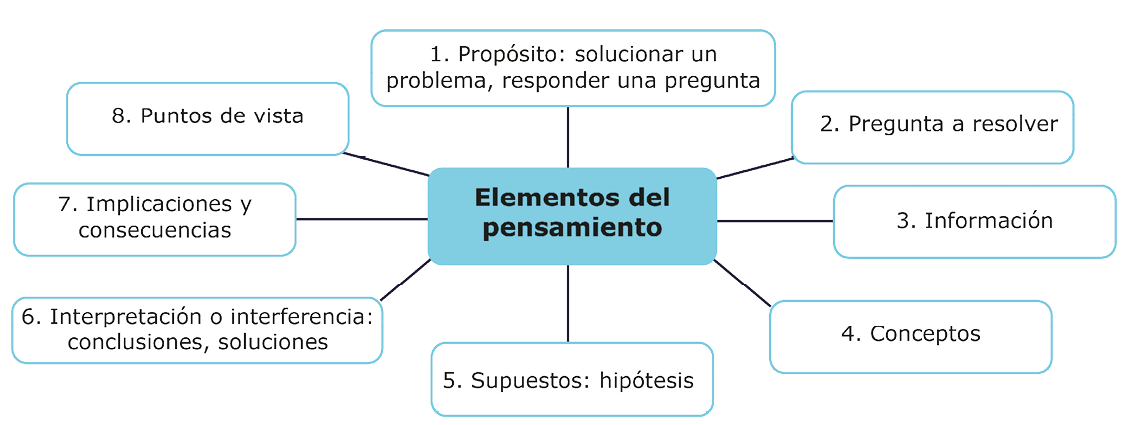 El pensamiento subyace de una serie de elementos (ver Figura 2) que permiten su generación y posibilitan su construcción interna a través de una situación que aporta información. Estos conceptos, enmarcados en supuestos, deben ser interpretados para tomar decisiones, teniendo en cuenta diferentes perspectivas, para generar una solución específica y oportuna.
