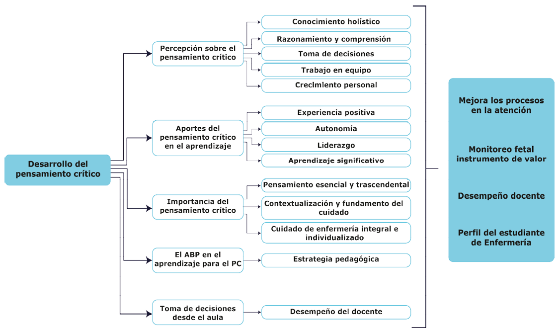 La percepción de los estudiantes frente a estas categorías de interés coincide, en términos del ABP, como una experiencia positiva y como aporte significativo en el aprendizaje en términos del pensamiento crítico. Esto posibilita el análisis y la comprensión de la información, la identificación de situaciones problema a partir de opiniones propias y críticas para explorar el conocimiento de mano de la evidencia científica. Por otro lado, el pensamiento crítico facilita el raciocinio de los estudiantes, generando autonomía y argumentación, las cuales ayudan a hacer inferencias objetivas y a trabajar en equipo, lo cual converge en la resolución de problemas mediante la toma de decisiones acertadas y pertinentes que aterrizan al estudiante a la realidad laboral.