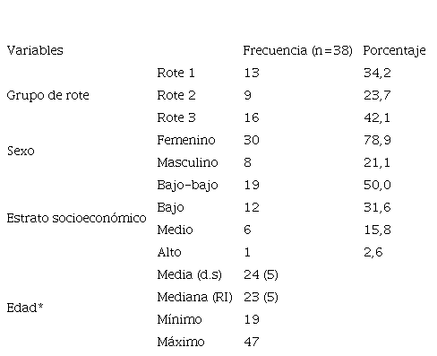 El 42,1 % de los estudiantes se encontraba en el rote tres; el 34,2 %, en el rote uno, y el 23,7 %, en el rote dos. El 78,9 % pertenecía al sexo femenino, y el 21,1 %, al sexo masculino. En cuanto al estrato, el 50 % tenía un estrato bajo-bajo, y el 15,8 %, un estrato medio. El promedio de la edad fue de 24 años, con una desviación estándar de +/- 5 años; según la mediana, el 50 % presentaba una edad igual o menor a 23 años; la edad mínima fue de 19 años y la mayor de 47 años.