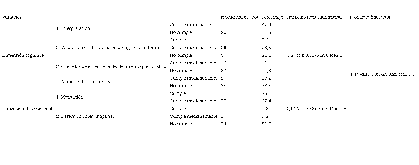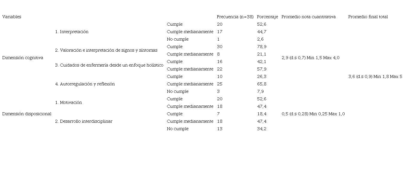 El objetivo general de este estudio fue fomentar el desarrollo del pensamiento crítico a través del ABP en los estudiantes del programa de Enfermería durante la realización e interpretación de la MFE. Un aspecto fundamental de este proceso fue la inclusión de habilidades blandas en la formación del profesional de la salud, dado que el pensamiento crítico es esencial para el procesamiento de información, la evaluación de evidencias y el razonamiento argumentativo (Enríquez et al., 2021). Esto facilita la toma de decisiones y abordajes pertinentes desde los procesos de atención que se requieren en enfermería. Dentro de estas habilidades y desde la dimensión disposicional, se destacan la motivación, la empatía y el desarrollo interdisciplinar (Rojas y Rodríguez-Peralta, 2020). En este sentido, el profesional de enfermería debe desarrollar e implementar dichas habilidades desde pregrado, de modo que, al interactuar con el paciente y su entorno laboral, pueda desempeñarse de manera más efectiva (Capacho y Cornejo, como se citó en Betancourth-Zambrano et al., 2020).