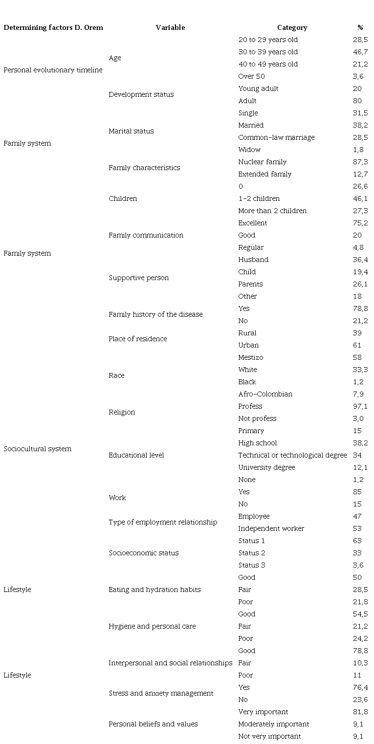 Related to the sociocultural system: place of residence, race, religion, educational level, job, type of employment relationship, socioeconomic status.