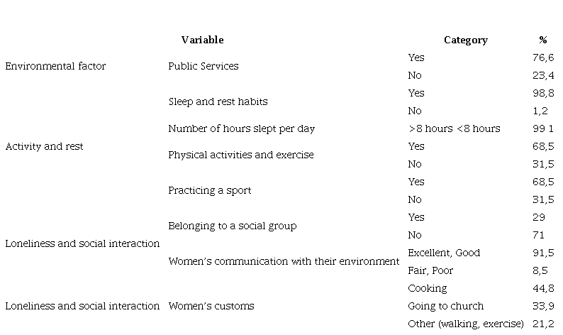 Among the universal self-care practices that promote health, 76.6% of women (126) use all public services; 98.78% (163) sleep and rest for more than eight hours; 68.49% (113) practice physical activities, exercise, or play sports; 70.90% (117) do not belong to any social group, and 91.5% (151) consider themselves to have good or excellent communication with the people around them. Among their habits, cooking was the most popular activity, with 44.84% of women reporting it as their favorite (see Table 2)