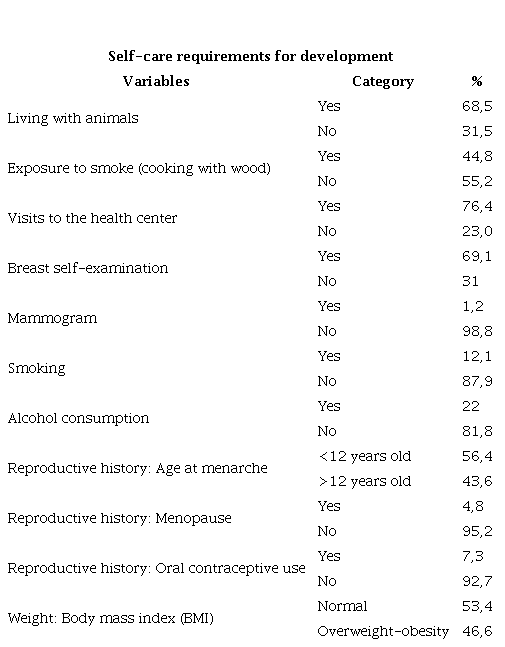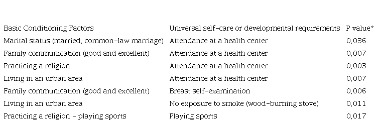 A statistical relationship of p<0.05 was observed when crossing the implicit variables ‘Universal self-care requirements’ and ‘Development self-care requirements’ of the FCBs of the surveyed women in the following aspects: marital status, intra-family communication (good and excellent), religion, and urban residence. These aspects are also related to frequent visits to a health center. Good and excellent intra-family communication is related to performing breast self-exams. Living in an urban area is connected to not being exposed to smoke from cooking with firewood. Practicing a religion was linked to participating in sports.