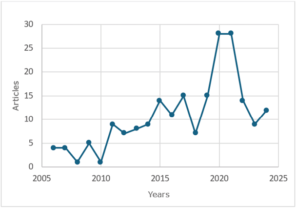 The notable growth in 2020 and 2021 coincides with the COVID-19 pandemic, an event that intensified scientific production on topics related to economic regulation in health, access to services, financing, and government response (Hale et al., 2021; Kickbusch & Holzscheiter, 2021). The pandemic tested the regulatory capacity of health systems, sparking debates about state intervention, drug price regulation, and striking the right balance between efficiency and equitable access to services (Arellano, 2022; Forero-Peña et al., 2020).