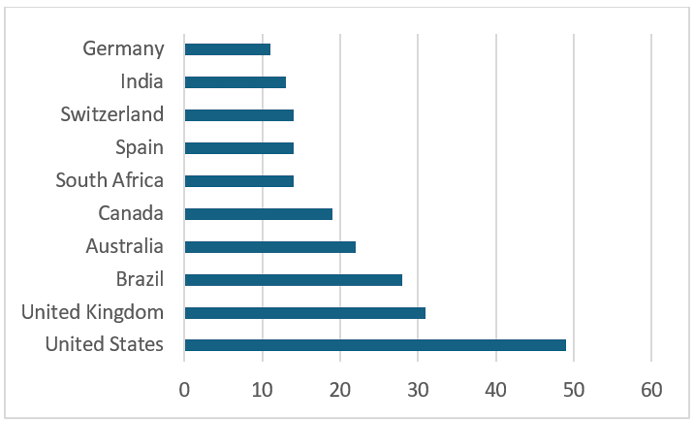 Figure 3 shows the worldwide scientific output. Notably, the United States accounts for over a quarter of the published documents, with 49 publications. This indicator also demonstrates the contributions of other countries to the field of study, including the United Kingdom with 31 publications, Brazil with 28, Australia with 22, and Canada with 19.
