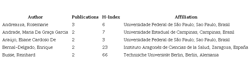Table 2 lists the five most influential authors and the number of research studies they have conducted. Brazil stands out with three publications. The h-index assesses a researcher’s work quality and influence (Koltun & Hafner, 2021). Busse has the highest score, followed by Bernal.