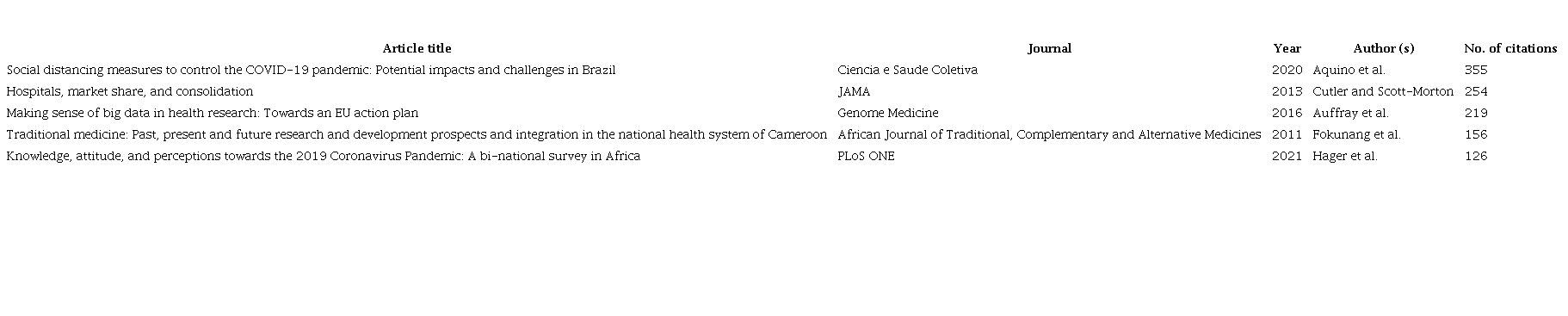 Analysis of the most cited articles provides a clear picture of the topics that have had a significant influence on academic literature and global health policy. Aquino et al. (2020) summarize the available evidence on the impact of social distancing measures on the epidemic and analyze the implementation of these measures in Brazil. Cutler and Scott-Morton (2013) discuss how hospital market consolidation affects competition, prices, and quality of care; Auffray et al. (2016) emphasize the growing importance of big data in health research and health policy formulation. Fokunang et al. (2011) present how research on traditional medicine can influence policy-making and health regulation. Finally, Hager et al. (2021) emphasize the importance of public perceptions and attitudes in the implementation of public health policies.