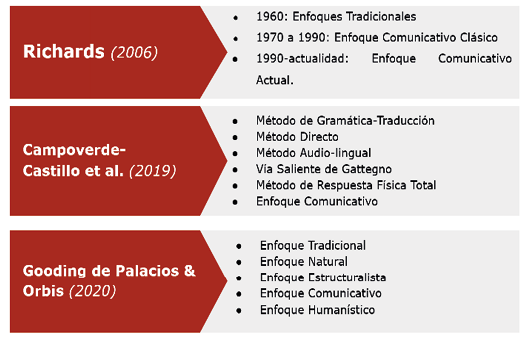 Existen diversas clasificaciones sobre los enfoques y métodos de enseñanza para la adquisición de un segundo idioma. En la Figura 1 se presenta una síntesis comparativa de las propuestas de tres autores en particular. El esquema evidencia puntos de convergencia entre los planteamientos teóricos, pues, por un lado, reconocen enfoques de carácter tradicional y, por otro, incluyen metodologías más recientes que responden a las transformaciones pedagógicas contemporáneas.