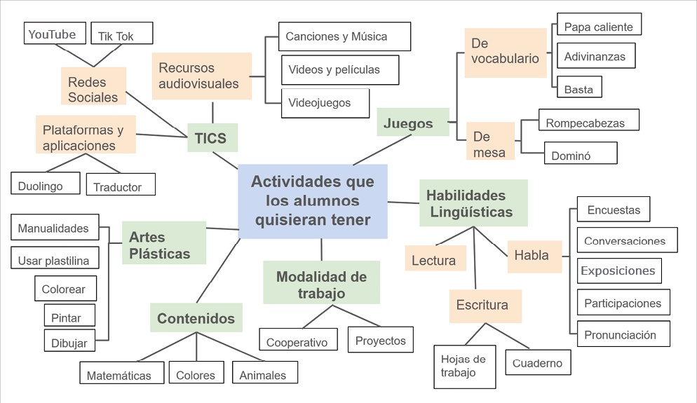 Los estudiantes manifiestan interés en actividades basadas en las artes plásticas, el uso de TIC y juegos. Dentro del primer elemento, mencionaron reiteradamente el deseo de dibujar, pintar y colorear. En cuanto a las tecnologías, expresaron interés por trabajar con recursos audiovisuales, especialmente canciones y videos, así como con aplicaciones como Duolingo y mediante redes sociales, entre las cuales la más mencionada fue TikTok. Por otro lado, como modalidades de trabajo propusieron el empleo de dinámicas cooperativas (en equipos o parejas) y el enfoque basado en proyectos.