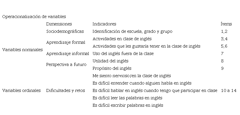 El instrumento empleado fue el cuestionario, diseñado con el propósito de cuantificar la información obtenida (Arribas, 2004). Se seleccionó con el fin de obtener un volumen de datos considerable y, posteriormente, sistematizarlos para realizar su análisis estadístico (Aigneren, 2005). Este instrumento incluyó una sección de preguntas de opción múltiple y abiertas (variables nominales) y otra de escala tipo Likert (variables ordinales).