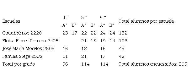 La selección de la muestra se hizo por conveniencia. Se decidió aplicar el cuestionario a los alumnos que cursaban los siguientes grados de primaria: 4.º, 5.º y 6.º de las cuatro escuelas, debido a que el instrumento podía ser autoadministrado, a diferencia de los grados inferiores, en los que algunos estudiantes todavía se encontraban en proceso de consolidar la lectoescritura. La aplicación de los cuestionarios estuvo a cargo de la autora de la investigación, con apoyo de las profesoras de inglés que laboraban en las escuelas, y se entregó a los estudiantes en formato impreso. Cabe aclarar que, en el Centro Eloísa Flores Romero 2425, no se pudo aplicar el cuestionario en el 4.o grado, ya que en ese momento los alumnos participaban en una visita escolar y, en días posteriores, no asistieron a clases por actividades propias de la organización escolar (ver Tabla 4).