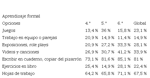Mientras que el aprendizaje formal se centra en el uso del cuaderno para copiar del pizarrón y contestar hojas de trabajo (prácticas que responden a un enfoque de enseñanza tradicional), el interés de los alumnos se orienta hacia un modelo que incorpore el uso de las TIC, los juegos y actividades de expresión oral en el marco del enfoque comunicativo. En este sentido, resulta relevante señalar que más de una tercera parte de las clases (33,9 %) incluye el uso de videos y canciones, y el 28 % se dedica al desarrollo de juegos de rol, dinámicas hacia las cuales los estudiantes manifiestan una marcada preferencia.