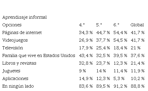 Por otro lado, se encontró que los estudiantes que interactúan con la lengua extranjera fuera de la escuela lo hacen principalmente a través de páginas de internet y videojuegos, con el 41,7 % global. Cabe resaltar que este porcentaje se incrementa en el último año de primaria respecto al cuarto grado en un 10 %. Sin embargo, el aprendizaje informal mediante libros, revistas y aplicaciones disminuye conforme avanzan los grados. Asimismo, se observa un porcentaje relevante en cuanto al uso del inglés con familiares que residen en Estados Unidos: 37,6 % global, 43,4 % en 4.º, 32,5 % en 5.º y 39,5 % en 6.º.