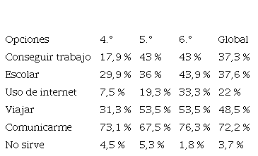 El 72,2 % de los alumnos encuestados opina que aprender inglés les sirve principalmente para comunicarse. En segundo lugar, y con el 48,5 %, considera que puede ser útil para viajar. Estos dos aspectos pueden estar relacionados con el hecho de que más de un tercio de ellos (37,6 %) emplea el idioma para hablar con familiares que residen en Estados Unidos. En un porcentaje menor, el 37 %, considera que el inglés puede servir tanto para conseguir trabajo como para el ámbito académico.