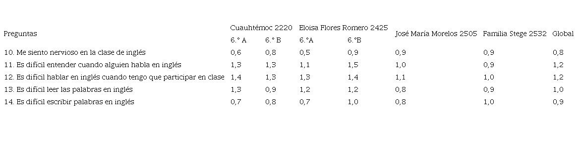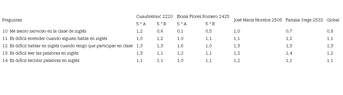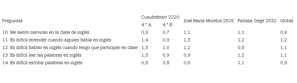 En la Figura 5, se puede observar que los estudiantes de sexto grado consideran que la escritura es la habilidad que les genera menor dificultad (0,9), mientras que expresarse en la lengua extranjera y comprender a un hablante resulta más complejo (1,2 en ambos casos). Por otro lado, manifiestan un bajo grado de ansiedad en el aula (0,8).