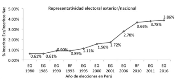 El análisis del voto migrante y de los electores peruanos en el exterior partió del análisis de los padrones y resultados electorales de los peruanos en el exterior en perspectiva longitudinal desde 1980. Esta población empezó a votar en el proceso electoral de 1980, y la última elección en que participaron fue en las elecciones generales de 2016 con un padrón de 884 924 electores, que representan el 3,86 % del electorado general. La evolución del crecimiento de este electorado exterior en el Perú se aprecia en la figura 1.