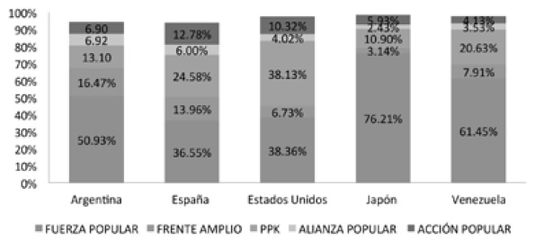 Como se observa en las figuras 2 y 3, los porcentajes con picos más altos de apoyo por partido político de los electores en el exterior en 2011 y 2016, por encima del 50 %, se concentró en el apoyo al fujimorismo. Nótese que en 2016 (véase figura 3), los peruanos en Japón llegaron a apoyar a Fuerza Popular, cuya líder fue Keiko Fujimori, en específico, con el 76,21 % de votos válidos. Altamirano (1992) hablaba de una lógica especial de los peruanos en Japón y, en efecto, hay un factor nipón en las preferencias del voto migrante hacia el fujimorismo. Los peruanos en el exterior en Japón, muchos de ellos nikkei o descendientes de japoneses, recurrentemente votaron en altas proporciones por el partido fujimorista.
