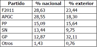 Es destacable la izquierda representada por IU que logró más votos válidos que a nivel nacional, el 0,3 % más votos válidos en el exterior. La tendencia hasta las elecciones generales de 1995 era en sentido opuesto, mucho más apoyo a la derecha y menos a la izquierda el apoyo del exterior en comparación con el electorado nacional.