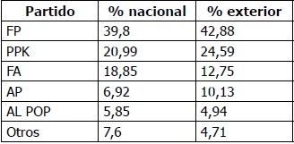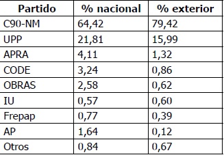 Resulta cuestionable que un sector tan anti-Fujimori como el exterior votara por C-90, el 15 % por encima del resultado a nivel nacional.