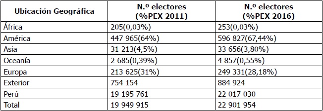 Como se aprecia en la tabla 11, la población electoral exterior estuvo concentrada en América tanto en 2011 como en 2016. De la desagregación estadística revisada de los padrones electorales de la ONPE y de los resultados históricos del Jurado Nacional de Elecciones [JNE] (2011) para las elecciones de 2011, se verificó del padrón de electores hábiles que el 46 % estuvieron concentrados en los Estados Unidos, Argentina (cuya ciudad con mayor población de peruanos en el extranjero fue Buenos Aires —94 655 electores—) y Venezuela. En segundo lugar, ya a nivel extrarregional, se verificó que Europa concentraba el 28,18 % de electores exteriores.