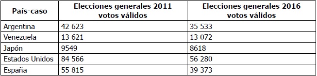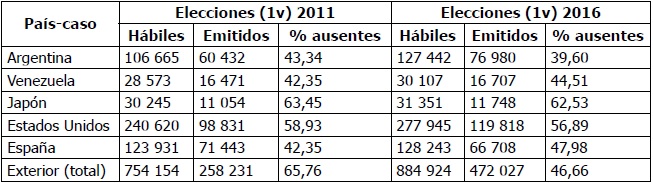 Considerando la hipótesis de que existe una variabilidad en los resultados electorales por país de residencia relacionada con diferentes tipos de electores migrantes, se analizaron los resultados electorales en los países-caso seleccionados en los procesos electorales generales de las dos últimas elecciones para el exterior (primeras vueltas de 2011 y 2016).