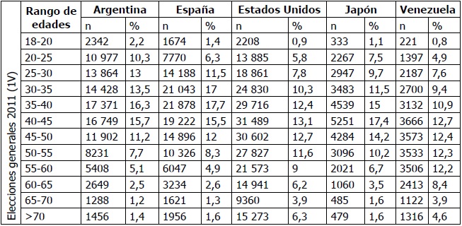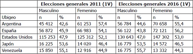 Cabe la pregunta: ¿Hay una feminización del electorado exterior? Se puede notar que existe una alta concentración de mujeres inscritas concentradas en los Estados Unidos y Argentina. ¿Será porque el tipo de trabajos que realizan las poblaciones peruanas allí son mayormente domésticos, labores más asociadas a la mujer migrante en estos lugares? Las poblaciones masculinas se inscribieron más en Japón y en Venezuela. Con respecto a la edad, la media del grupo etario de los electores hábiles se dio entre 55 y 66 años. Se verifica que, cuanto más edad, menos son los electores que se inscriben para votar en el Perú. Los más jóvenes se encontraron asentados en Argentina y España.