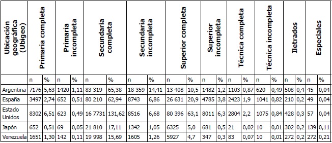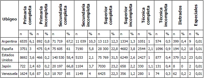 A nivel educativo, más del 60 % del electorado exterior tenía secundaria completa. En proporción, son los más educados, sobre todo las personas que se van a países donde las competencias de idioma implican mayores desafíos como Japón. El migrante que se va a radicar a Japón tiene y asume que va a tener que involucrarse en la sociedad con mayores competencias educativas que el peruano que migra a Argentina, Venezuela o España, donde la comunicación es en el mismo idioma español, por ejemplo (véanse tablas 13-17).