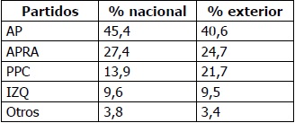 Si se suman los dos porcentajes de votos válidos de los partidos ganadores en el exterior en las elecciones 2011 y 2016, respectivamente, se observa entre un 50 y un 60 % de aprobación a los partidos de derecha tradicional peruana. Un porcentaje aproximado parecido a lo que obtuvo la candidata Lourdes Flores de UN en las dos precedentes elecciones (2001 y 2006).