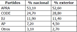 En la tabla 3, se describen los resultados de las elecciones de 1985, donde se puso de relieve la debilidad de las identificaciones partidarias. El apoyo mayoritario del exterior pasó de AP en 1980 a APRA en 1985. En estas elecciones, volvió a coincidir la tendencia de apoyos respecto del electorado nacional. Alan García, candidato por APRA, fue apoyada por gran mayoría por el electorado exterior.