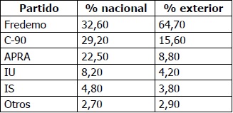 En las elecciones de 1990, el voto extranjero reflejó los apegos a valores neoliberales como la solución económica a la crisis del país. Sincronizaron el nivel nacional y exterior en la tendencia nacional de rechazo a APRA y a los partidos, en general. Sin embargo, a diferencia del resultado nacional, el Frente Democrático (Fredemo) representó el partido que capturó los votos de los peruanos en el exterior como se muestra en la tabla 4.