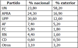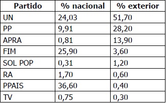 Sin embargo, la victoria de UN en estas elecciones con la figura de Lourdes como mujer candidata presidencial tuvo un importante efecto desde la visión posmoderna aprendida en los países más liberales donde residía la mayor parte de los peruanos en el exterior. Además, UN atrajo al electorado exterior con propuestas directas que consideraba al electorado migrante como motor económico del país (véase tabla 7).