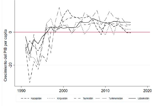 Después de su independencia, las economías de Asia Central experimentaron una transición desde un modelo de planeación centralizada hacia una economía de mercado con periodos de hiperinflación y desindustrialización, en el cual Kazajistán y Kirguistán han avanzado hacia la consolidación de economía de mercado, mientras que Turkmenistán y Uzbekistán aún están en proceso de transición. Por último, Tayikistán se encuentra en un estado intermedio ( Batsaikhan y Dabrowski, 2017).