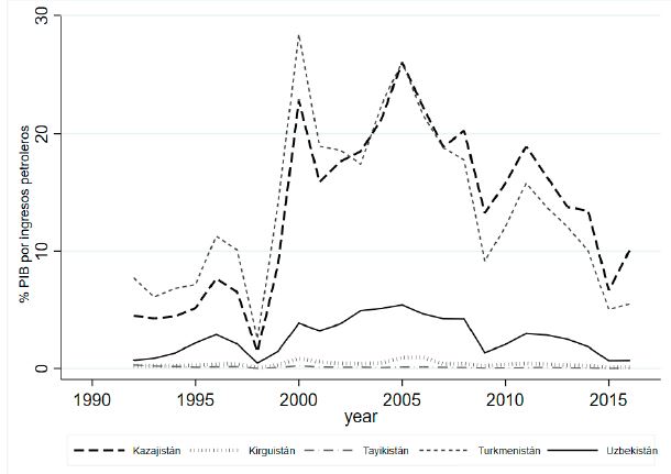 A nivel de crecimiento económico, el comercio internacional representa uno de los componentes más importantes del PIB, en el cual, para los casos de Turkmenistán y Kazajistán, como se muestra en la Figura 4, hay una alta participación de los ingresos del sector petrolero. En efecto, los países de Asia Central experimentaron una bonanza económica durante 2000-2005 por el incremento en los precios de las materias primas, en el cual, para los casos puntuales de Turkmenistán y Kazajistán, al menos un 25% del PIB de los países estaba asociado a ingresos petroleros. Sin embargo, esta prosperidad se vio afectada por la caída en el precio de los recursos energéticos y la gran recesión de 2008, la cual disminuyó las remesas de los migrantes.