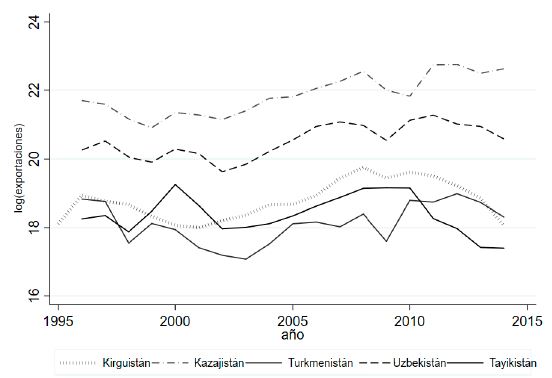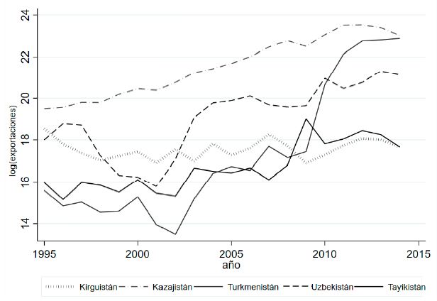 Las exportaciones de los países centro asiáticos evidencian una disminución de las exportaciones hacia Rusia desde 2010, a excepción de Kazajistán, el cual ha presentado una tendencia estable. Tayikistán ha mostrado una disminución, al pasar de 5,80 miles de millones de dólares en 1998 a 3,70 miles de millones en 2013. Kirguistán, por su parte, ha visto una disminución en sus exportaciones, al pasar de 9,15 miles de millones de dólares en 1999 a 7,01 miles de millones en 2014, respectivamente (ver Figura 6).