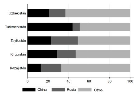 Dentro de la región se destaca Kazajistán como uno de los actores económicos más dinámicos. De acuerdo con las cifras del Observatorio de la Complejidad Económica del MIT (2018), durante 2017 Kazajistán exportó hacia China 5,86 billones de dólares con una participación dentro de las exportaciones del país del 13%. Los principales rubros de exportación fueron cobre refinado (19%), mineral de cobre (16%), aleaciones ferrosas (15%), petróleo crudo (15%) y químicos radioactivos (18%). Para el caso de Rusia, las exportaciones en 2017 fueron de 4,73 billones de dólares con una participación del 11% entre las que se encontraron hierro laminado en caliente (11%), productos laminados planos de hierro, mineral de cobre (9,1%) y briquetas de carbón (5,4%).